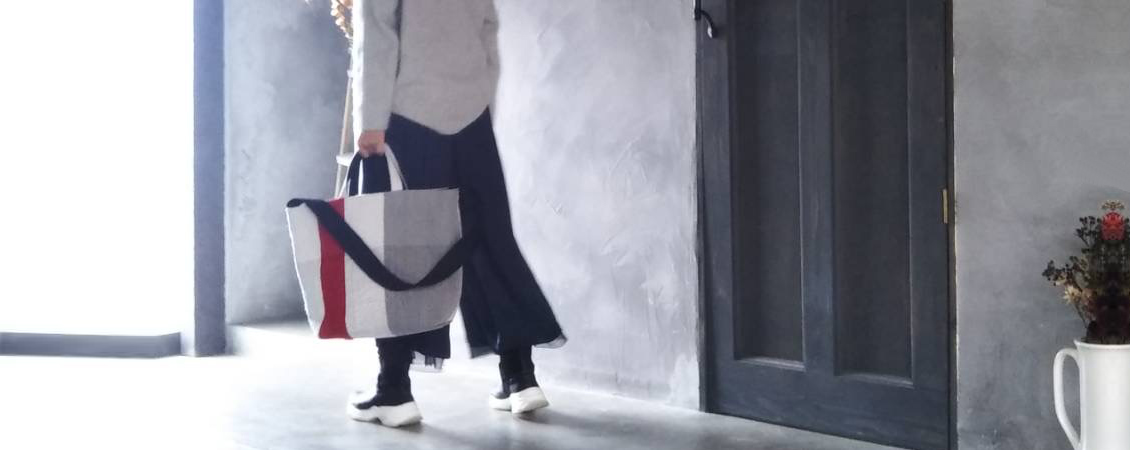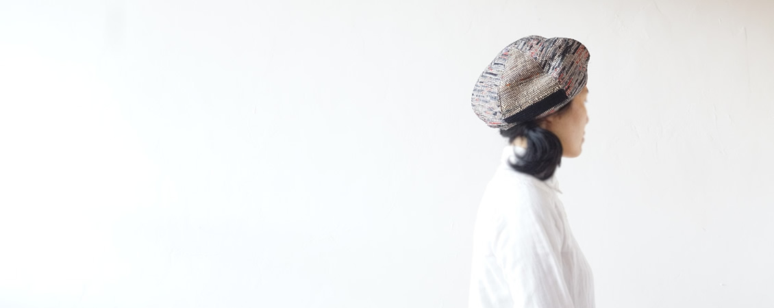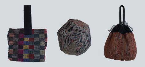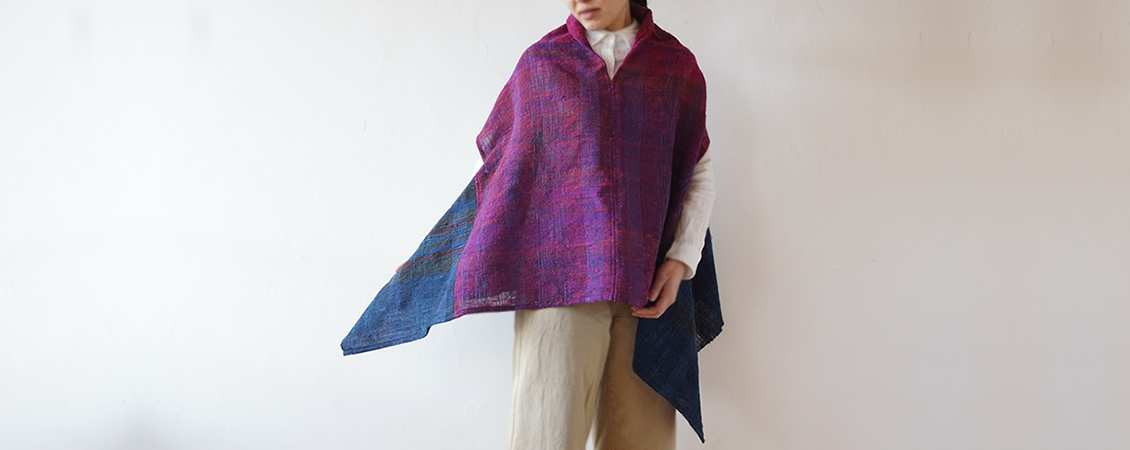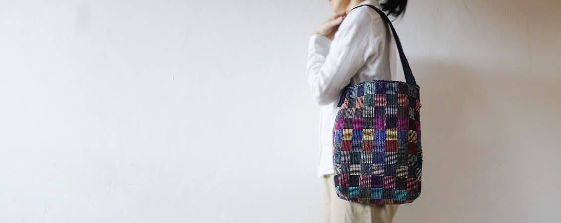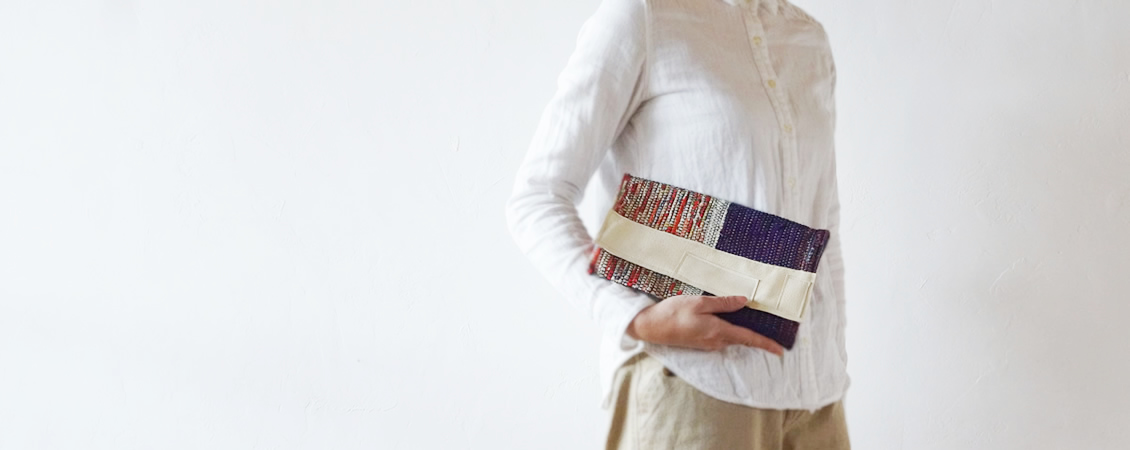 横糸に古い着物を裂いたもの、経糸には仕立てる作品に合わせての配色のみならず、洋服なら軽くて発色の美しい絹糸を、バッグなら強度を上げるため木綿糸を二本取りして、使っていただくお客様のことを想い、心を込めて織り上げ、その美しい唯一無二の柄を活かしたデザインで仕立て上げる、シンプルながらも個性的な作品です。
