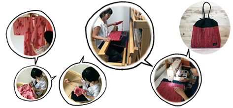 naonaoの裂き織りは、 一点一点、作品イメージに合った着物を選び、ほどき、裂き、織り、仕立てる。手間ひま掛けた工程を経て、ひとつひとつ丁寧に作られていきます。